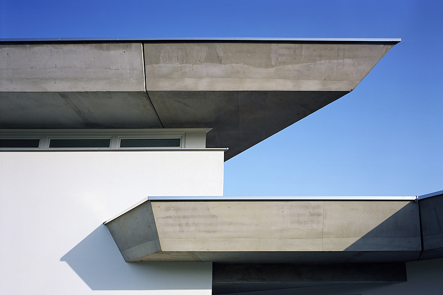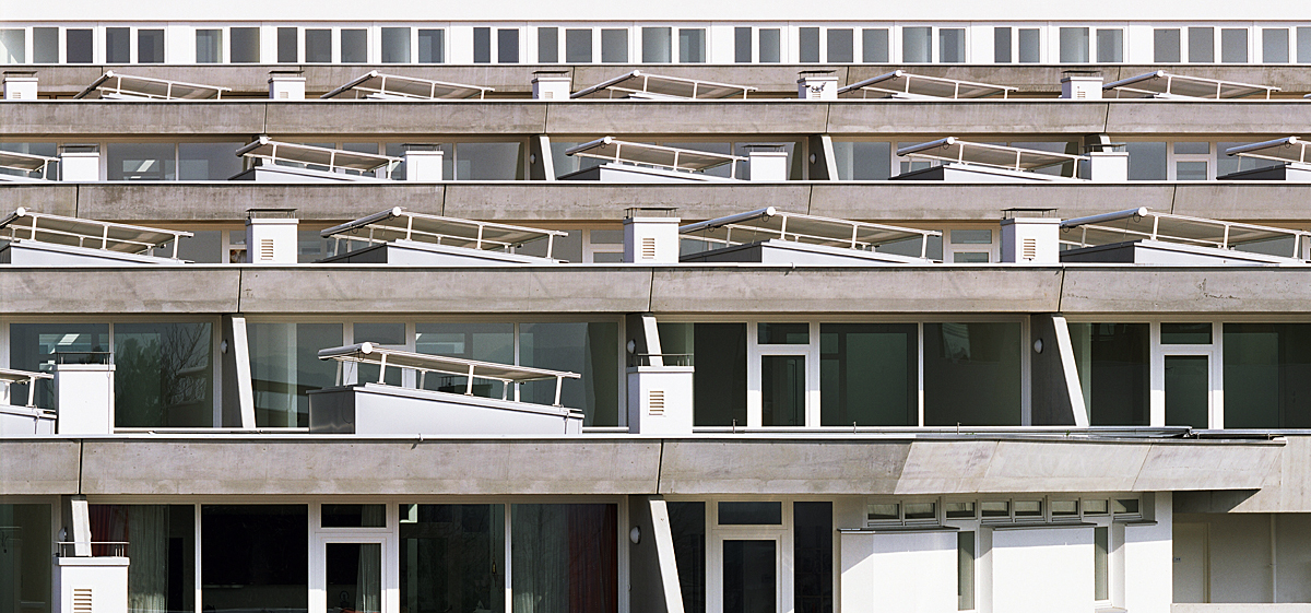 Konstruktiv war so ein Kraftakt mitsamt der begrünten Dächer, die wie Kaskaden den Hang hinabgleiten, nur in Stahlbeton möglich. Um im Kostenrahmen des geförderten Wohnbaus zu bleiben, sind alle sichtbaren Fassadenelemente aus Betonfertigteilen. Massive Vordächer schützen vor zu viel Sonne und lassen die Zeilen wie horizontale Schichtenlinien wirken. Auch dafür hat Linsberger eine Erklärung parat: „Ich wollte die Weingartenlandschaft in die Architektur übersetzen.“ Darunter sind lange, zarte Glasbänder in die Fassade geschnitten.