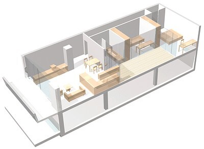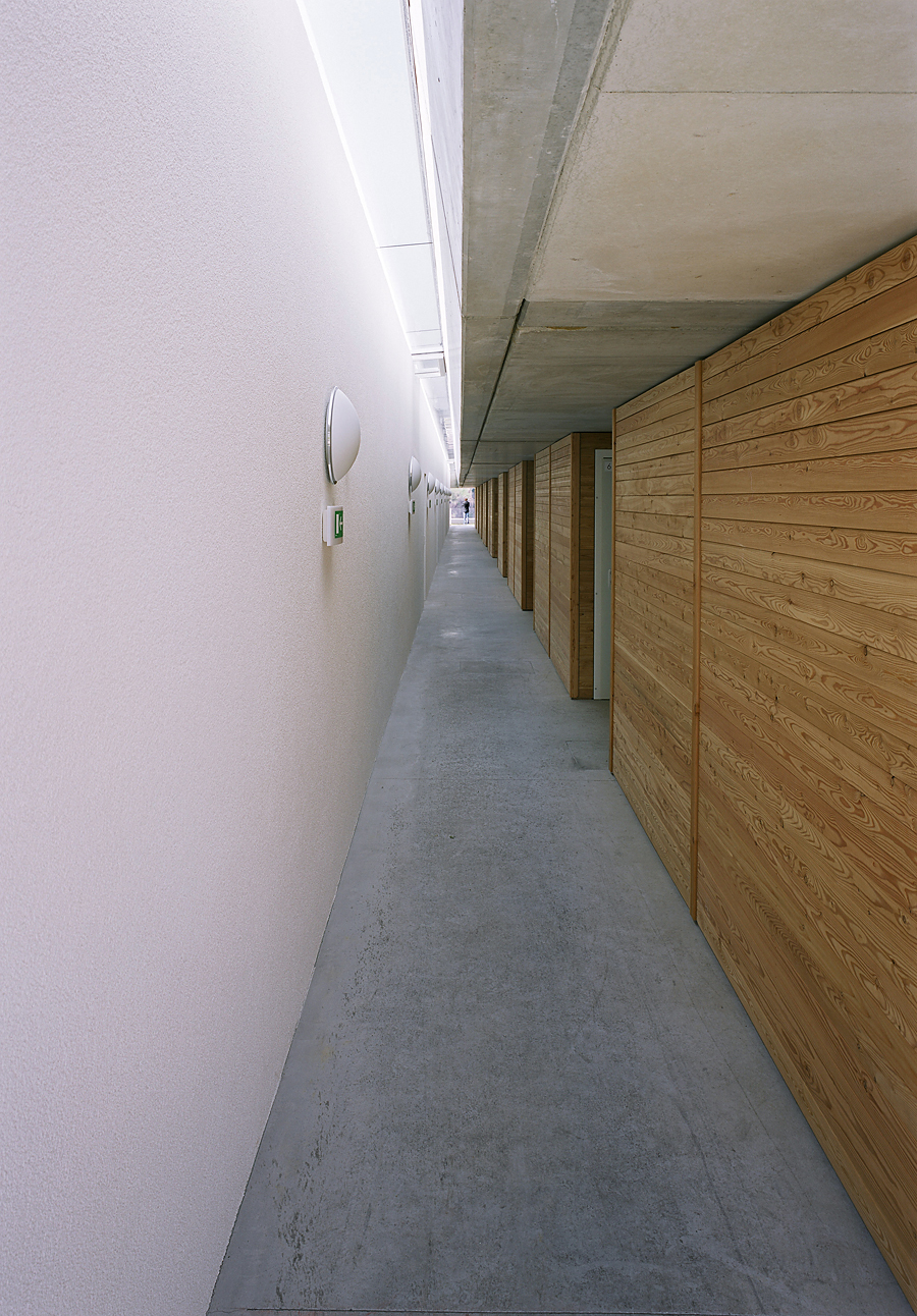 Obwohl die Anlage optisch größte Dichte suggeriert, gibt sich die Erschließung der Wohnung ungewohnt locker. Vor den Türen gibt es sogar noch Platz für hölzerne Boxen, die für Stauraum sorgen und die Gänge rhythmisieren.