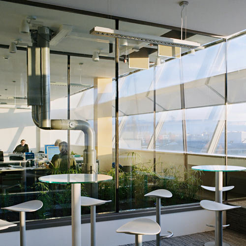 Was nützen alle Maßnahmen des Energiesparens, wenn sie nicht mit höchster Lebensqualität für den Nutzer einhergehen? Eine Neuheit ist die Nutzung von Pflanzen zur natürlichen Befeuchtung und Konditionierung der Raumluft während der Wintermonate. Da die in die Lüftung integrierte Feuchterückgewinnung in Bürogebäuden behagliche Luftfeuchtigkeiten von 50% im Winter nicht bereitstellen kann, hat pos architekten viergeschossige Pflanzenpufferräume entwickelt, die als abgeschlossene Feuchtgeneratoren präzise steuerbar sind und absolut ökologisch zusätzliche Feuchte ins haustechnische System speisen und Schadstoffe aus der Luft filtern.