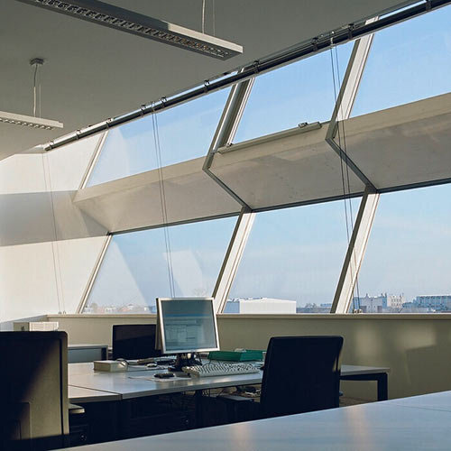 „Kein Mensch bedenkt, dass im Sommer in herkömmlichen Büros ein Teil der Arbeitsplätze nicht nutzbar ist“, sagt Architektin Ursula Schneider, „trotz Jalousien kann man im unmittelbaren Bereich der Fassade nicht sitzen, ohne dass einem die Schweißperlen auf der Stirn stehen.“ Kein Problem in der Energy-Base. Hinzu kommt, dass das Tageslicht aufgrund der großräumlichen Struktur bis tief in die Gebäudemitte gelangt. Vorbei die Zeiten des finsteren Klogehens und Teekochens. Oberlichte lautet das Motto der Stunde, mit dem - auch auf diese Art - Strom gespart werden soll.