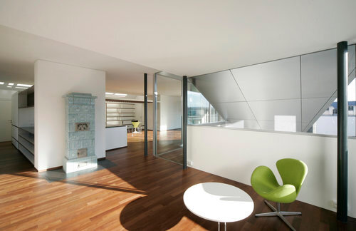 Ein stilvoller Kachelofen aus dem Bestand des Stadthauses wurde im Wohnzimmer eingebaut. Das ist aber auch schon das Einzige, das in der modernen Wohnung an das denkmalgeschützte Haus erinnert. Modern ist vor allem die Erschließung: Man betritt das Penthouse über einen Luft, der von der Tiefgarage schnurstracks in die Wohnung fährt.