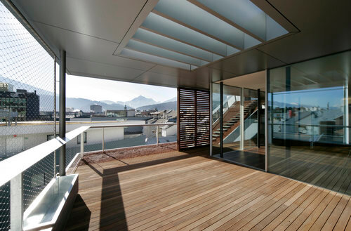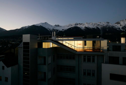 An klaren Wintertagen ist der Ausblick vom Sonnendeck sensationell. In Augenhöhe mit den Kirchtürmen der Stadt schweift der Blick über die schneebedeckten Gipfel der Nordkette bis weit hinein ins Unterinntal. Wenn es hier oben zu kalt wird, führen Stufen auf einer Rampe, die übrigens als Wiesenstreifen für den Sommer und nicht für Rodelaktivitäten angelegt wurde, auf eine südseitige Terrasse, von der aus man hinter die Glasschiebetür direkt ins Warme schlüpfen kann.