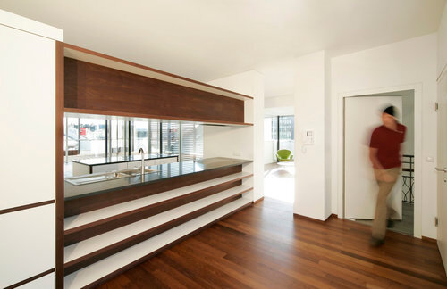 „Alles sollte vom Feinsten sein“, freuten sich die Beaufort Architekten schließlich über das Okay zu ihrem Vorschlag einer einzigen Wohnung. Wenn schon Penthouse, dann exklusiv, lautete die Devise. Böden und Möbel wurden in heimischer Akazie ausgeführt und mit weißen Schichtstoffplatten kombiniert. Im Außenbereich, wo für die Fassadenverkleidung der Verbundwerkstoff Alucobond zum Einsatz kam, setzt sich der Holzboden fort.
