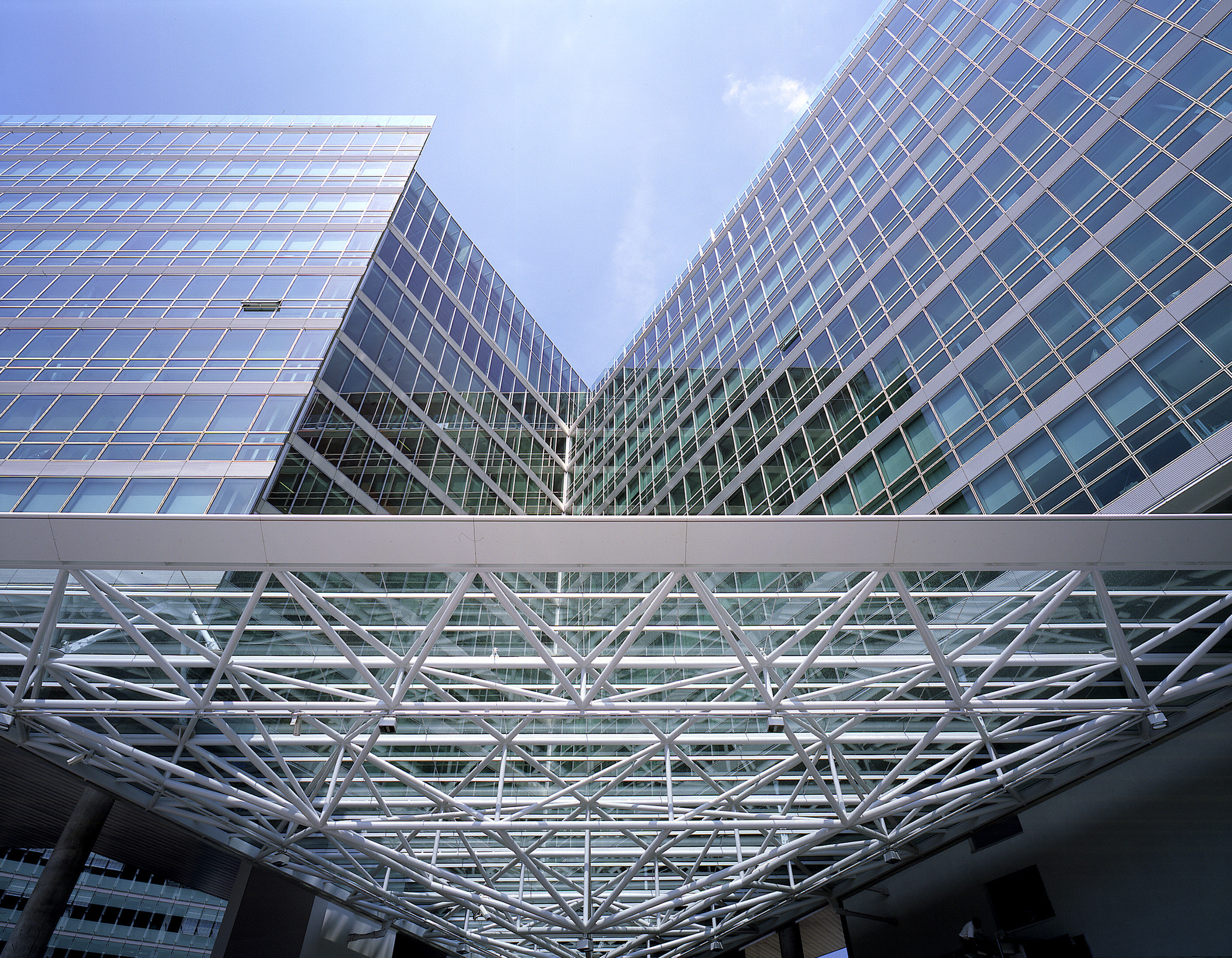 Die Antwort lautet: Statikerwettbewerb. Aus mehreren Entwürfen namhafter Statikbüros fiel die Entscheidung zu Gunsten des statischen Entwurfs von Gmeiner & Haferl, die nicht, wie üblich, auf Zug beanspruchte Stahlbauteile als hängendes „A“ einsetzten, sondern das statische Konzept auf den Kopf stellten und somit in ein stützendes „V“ verwandelten. So wird die Last der acht Geschoße direkt in die drei Stiegenhauskerne und in die herumstehenden Stahlbetonpfeiler eingeleitet. Das klingt zwar wieder einmal nach Stahlbetonwald (vor lauter Bäumen sieht man das Schweben des Hauses nicht mehr), doch die notwendigen statischen Elemente wurden in ihrer Anzahl auf ein Minimum reduziert und sind von der Fassadenfluchtlinie weit ab- und in die Gebäudemitte eingerückt. Die Konstruktion erscheint zurückhaltend, die Auskragung ist beachtlich.