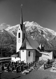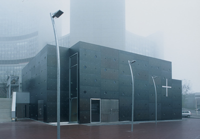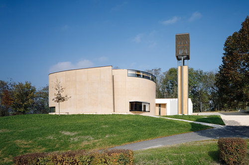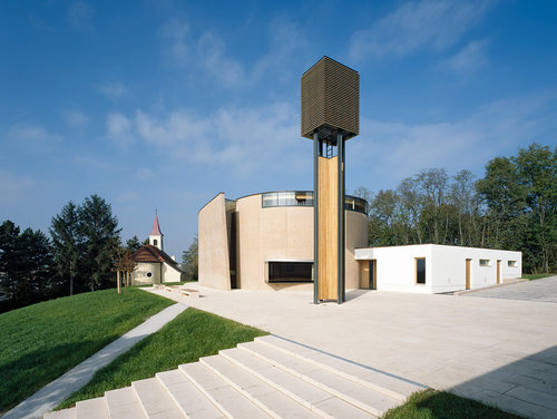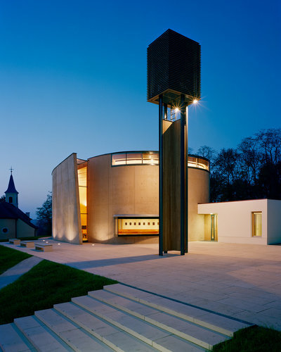 Dem Bauplatz auf einer Hügelkuppe zwischen der erwähnten Notkirche und der Florianikapelle aus dem 19. Jahrhundert schrieben sie einen schlichten Baukörper ein, der von einem über eine flach ansteigende Freitreppe erschlossenen Platz gefasst wird. Der Kirchenraum selbst entwickelt sich über einem annähernd ellipsenförmigen Grundriss. Ein flacher kubischer Anbau birgt Eingang, Nebenräume und nördlich gelegene Vorhalle. Ein frei stehender Glockenturm auf kreuzförmigem Grundriss am imaginären Schnittpunkt von östlicher und südlicher Gebäudeflucht definiert eine unmittelbare Vorzone. Auch wenn die Öffnungen der Betonhülle, die im Ton des Lehms der lokalen Weinberge gefärbt ist, sparsam gesetzt sind, bieten sie schon von außen viel Einblick in den Kirchenraum. Der Zugang hingegen ist in einer wohlüberlegt choreografierten Abfolge in Spiralform gestaltet und führt über einen Vorraum vorbei an einem kleinen bekiesten Lichthof in die Vorhalle der Kirche. Hier befindet sich symbolträchtig gleich am Eingang als Zeichen des Anfangs eines christlichen Lebens der Taufbrunnen, der zugleich als Weihwasserbecken genutzt wird. In der Nordwand der zum Kirchenraum hin offenen Vorhalle sind in einer horizontalen Reihe aus 14 quadratischen Fenstern die Kreuzwegstationen dargestellt.