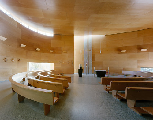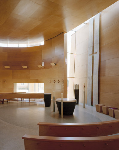 Das Innere ist im Gegensatz zur harten Betonschale mit Platten aus Buchensperrholz verkleidet, die für eine Atmosphäre der Geborgenheit sorgen. In drei Segmenten sind die Bankreihen im Halbkreis um den Altarbereich angeordnet. Selbst wenn die 140 Sitzplätze nur spärlich besetzt sind, kommt dank der Konfiguration und Dimensionierung des Raumes, der nach oben mit einer auch akustisch günstig wirksamen, konvex gekrümmten Holzdecke abgeschlossen wird, keinerlei Gefühl von Verlorenheit auf. – Es gehört zur Mindestanforderung eines Kirchenbaus, adäquaten Raum für die Liturgie bereitzustellen. Schermann und Stolfa gelang es darüber hinaus, bei aller Schlichtheit und formaler Zurückhaltung eine ausgesprochen vielseitige Bühne für Inszenierungen und Rituale zu schaffen. Zusätzlich zum bereits geschilderten etappenweisen Heranführen in das Kircheninnere können dank dem weiteren, westlichen Ausgang und dem ausreichend dimensionierten Platz im Freien zu den entsprechenden Gelegenheiten Prozessionen durch die Kirche und um sie herum geführt werden.