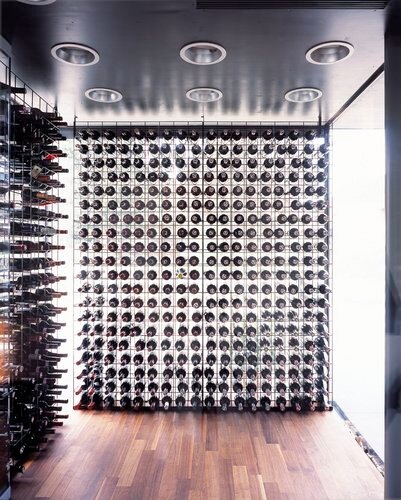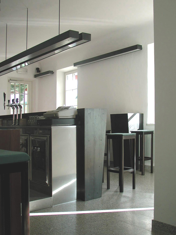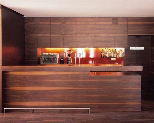 Dunkles Nussholz für die Bar und Fußboden; helle Champagnerfarbe als Lehmputz für die Wände
