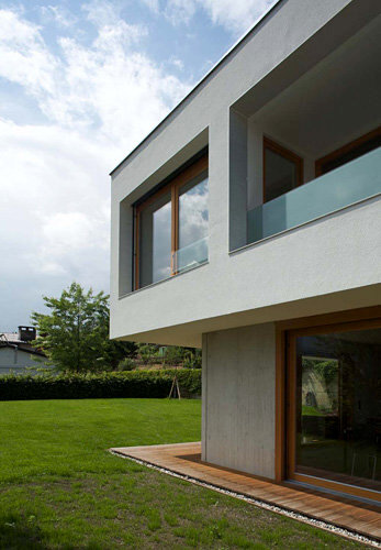 Entstanden ist ein schlichter Baukörper, der sich entlang einer Mauer am nördlichen Grundstücksrand erstreckt. Der Entwurf ist klar strukturiert und gut durchdacht. Ja nicht einmal der Zugang zum Haus tanzt aus der geometrischen Ordnung. Die umlaufende Auskragung des oberen Geschoßes verleiht dem Gebäude einerseits mehr Körper und dient als wertvoller Schattenspender, andererseits ermöglicht sie es, zu den beiden Wohnungstüren zu gelangen, ohne dabei nass zu werden.