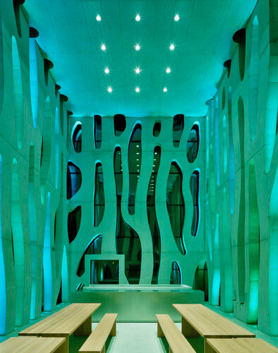 Für die Allgemeinbeleuchtung wurden 30 Downlights in die rohe Betondecke eingebaut. 125 LED-Leuchten sorgen für eine effektvolle Akzentuierung in der Fassade. Damit die Leuchten von den Besucherinnen und Besuchern möglichst nicht gesehen werden, wurden sie in die Laibungen, sozusagen in die Astgabeln, eingelassen (Abb. 16). Sämtliche benötigten Leerrohre für die Kabelführung befinden sich zwischen der Bewehrung im Beton, in den Decken sowie in den «Ästen» und «Stämmen». Damit die Strahler (Abb. 15) nur die Astgabeln beleuchten und kein Streulicht in den Raum abgeben, wurde auf die Leuchte eine extrem asymmetrische Sekundäroptik mit einer Linse gesetzt.[1] Diese erlaubt eine weite Abstrahlung in die Laibung, lässt das Licht quer dazu, aber nur sehr eng in den Raum, sodass keine Blendung entsteht. So wird auch das Licht der wenigen Strahler, die direkt in die Bodenplatte eingesetzt wurden, nicht als unangenehm empfunden. Jede Leuchte ist mit je vier Highpower-LED in Rot, Grün und Blau (RGB) ausgestattet und kann direkt über eine DMX-Steuerung angesprochen werden.[2] Die zwölf Lichtpunkte sind nicht symmetrisch gesetzt, sondern so, dass die Abstände der drei Farben immer so gering wie möglich gehalten sind und damit die bis zu 9 m hohen Hohlräume möglichst gleichmässig ausgeleuchtet werden. Zu Beginn der Planung waren noch RGB-W-Leuchten angedacht, pro Farbe drei LED. Die weissen LED wurden dann aber zugunsten des Lumenoutputs der farbigen LED weggelassen, und es wurden jeweils vier LED eingesetzt. Reines Weiss gibt es als Beleuchtung damit nicht, für die Fassade wird via DMX ein Weiss aus den Farben gemischt. Mithilfe der eingesetzten Steuerungssoftware werden die Farben Rot und Grün, die ein stärkeres Lumenoutput haben als Blau, heruntergeregelt und Blau zu 100 % eingeschaltet. Dabei nutzt man den Effekt, dass das menschliche Auge sehr träge ist und das Gehirn einen etwaigen Farbstich korrigiert. Die Lichtplaner programmierten einige Lichtszenarien, vom kühlen Weiss über wallende grün-türkise Farbverläufe, die an Schilf im Wasser erinnern sollen, bis hin zum «Feuer», bei dem das Gebäude mehr und mehr in den gelben und roten Lichtflammen aufgeht (Abb. 12).