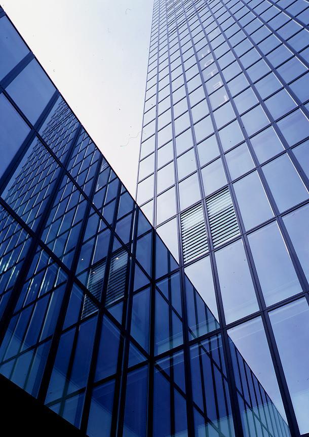 Im Erdgeschoss des Gebäudes trennen sich die Wege: Zum Servicezentrum der Messe fährt man über die Rolltreppe hinauf ins erste Obergeschoss, die grosszügige Halle dient als Bar- Lounge und Reception. Spektakulär ist der Raum gewordene Lüster, ein rechteckiger, von hell erleuchteten Lichtbrüstungen umgebener Schacht, der die Geschosse des Vorbaus durchstösst und durch das Glasdach hindurch den Blick auf die Vertikale des Turms freigibt. - Der 8 Meter über der Strassenebene, 12 Meter nach Osten und 24 Meter nach Süden auskragende Bauteil stellt das eigentlich spektakuläre Element des Entwurfs dar. Die untere Ebene beherbergt das Servicecenter, während darüber der Restaurant- und Konferenzbereich angeordnet ist. Eine von aussen sichtbare Stahlfachwerkkonstruktion, deren Diagonalen an dem sonst durch strenge Orthogonalität bestimmten Gebäude einen expressiven Akzent setzen, erlaubt es, das Innere weitgehend stützenfrei zu halten und das Gewicht des Auslegers zu reduzieren. Im Gleichgewicht gehalten wird der augenfällige Bauteil durch den als Auflagermasse fungierenden Turmbau. Nicht nur die Fassaden des Auslegers sind vollständig mit Glas verkleidet, sondern auch dessen Dach und dessen Unterseite.