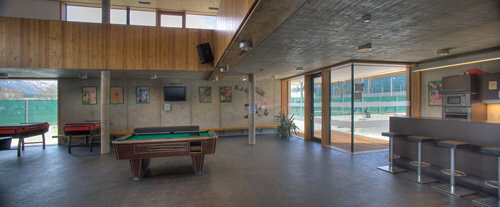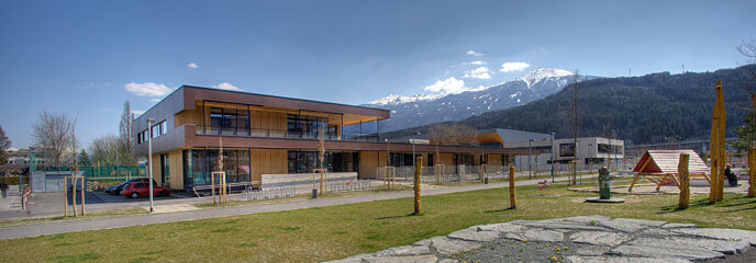 Tivoli ist ein neuer Stadtteil in Innsbruck auf dem Areal des gleichnamigen alten Stadions. Architekt Helmut Reitter hat hier, gleich neben dem Freibad, einen Kindergarten mit Hort und ein Jugendzentrum errichtet. Der Kindergarten, ein lang gestreckter Pavillon, der sich im Bereich des Hortes zu einem zweigeschossigen Baukörper faltet, ist ein reiner Holzbau. Das Jugendzentrum, ein kubischer zweigeschossiger Bau, ist hingegen in Massivbauweise errichtet. „Schon beim Wettbewerb ist uns die Materialwahl schlüssig vorgekommen“, sagt Reitter. Dafür habe es keine funktionale, sondern eher eine emotionale, atmosphärische Begründung gegeben. Der Kindergarten ist ein Holzriegelbau mit tragenden Innenwänden und Decken aus Brettsperrholz sowie Innensäulen und Unterzügen aus Brettschichtholz. Außen ist der Baukörper mit einer verdeckt befestigten Eichenfassade und im Bereich der Attika mit dunkelbraunen Hochdruck Schichtstoffplatten (hpl-Platten) verkleidet.