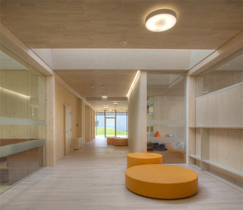Alle vier Gruppenräume sind nach Westen orientiert, hin zu einem überdachten Außenspielbereich. Zwischen den Gruppenräumen liegen kleinere Einheiten, die in den Mittelgang hineinverschoben sind, sodass dieser zusätzlich belichtet wird und terrassenseitig kleine geschützte Atrien entstehen. Bewegungsraum, Ruheräume, Essbereich und Nebenräume liegen im Osten. Ein breiter, über Lichtkuppeln mit Tageslicht belichteter Mittelgang verbindet die beiden Bereiche. Der Boden ist aus Eiche, die Wände sind aus Lärche und die Decken mit Weißtannen-Akustikpaneelen verkleidet. Um die unterschiedlichen Holzarten aufeinander abzustimmen, wurden die Wände weiß lasiert und der Boden weiß geölt.