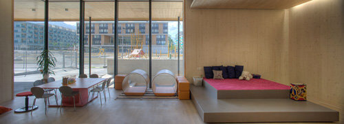 Es regnet schon seit den Morgenstunden und scheint nicht aufhören zu wollen. Natürlich können die Kinder an solchen Tagen nicht hinaus in den Garten gehen. Dafür dürfen sie den breiten Mittelgang mit ihren Dreirädern rauf und runter fahren. Der neue Kindergarten am Tivoli hat auffallend viel Platz und auffallend viele Fensterflächen. Sind die Kinder gerade nicht ins Spiel vertieft, stehen sie sehr gerne an den raumhohen Fensterscheiben und beobachten, was auf der Straße passiert. Doch wo man rausschauen kann, kann man auch reinschauen. Für die Kindergartenpädagoginnen war diese Transparenz zu Beginn ungewohnt – ebenso wie die Tatsache, von nun an in einem reinen Holzbau zu arbeiten. Gerne erzählt die Kindergartenleiterin Judith Singer-Bassetti von dem Aha-Erlebnis der Eltern: „Alle, die zum ersten Mal hier hereinkommen, sind begeistert von dem Geruch.“