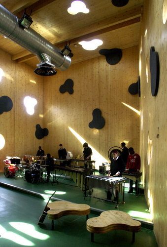 Projektingenieure waren Michael Hadi Associates. Mit ihnen arbeiteten drmm ebenso eng bei Materialtests und Computer- wie physisch gebauten Modellen zusammen wie mit dem steirischen Brettsperrholzhersteller selbst. Die eingesetzten großen Plattenformate entsprachen auch dem Wunsch, nachhaltiges Bewusstsein bereits in den Fertigungsprozess zu integrieren und Schnittabfall zu minimieren. Während de Rijke die Konstruktion des Sportgebäudes als relativ »straightforward« bezeichnet, verhält es sich beim Musikgebäude vollkommen anders. Hier wurden alle Räume konstruktiv voneinander getrennt, um jegliche Klangübertragung zu vermeiden. Auf mechanische Ventilation wurde verzichtet und stattdessen – ausgehend von kleinen Perforationen in der Gebäudehülle – ein ausgeklügelt simples, natürliches Belüftungssystem installiert. »Immer noch muss man Auftraggeber vom Holz überzeugen«, so de Rijke, »obwohl Holz das einzige Baumaterial ist, das einen Beitrag zur CO2 -Reduktion leistet«. Nur wegen des Geldes nehmen drmm Aufträge nicht an, es geht um mehr: um die Herausforderung, wirklich Interessantes entwickeln zu können, um ökologische Qualität, sozialen Anspruch und avancierte, materialbasierte Ästhetik. Im britischen Pavillon auf der heurigen Architektur-Biennale in Venedig, in den drmm von Kurator Ellis Woodman eingeladen wurden, kann man sich von diesem Anspruch ein Bild machen.