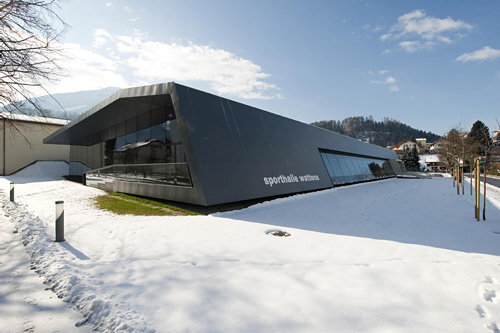 Wattens ist Swarovski-Land mit allem, was dafür und dagegen spricht. Es ist der Schauplatz ei- nes – durchaus bemerkenswerten – MPreis-Supermarktes von Dominique Perrault. Und neuerdings ist es auch der Standort eines Sportzentrums von recht eindrucksvollen Ausmaßen. Johann Obermoser und Thomas Schnizer haben es geplant und dabei mustergültig vorgeführt, wie sich ein ziemlich gewaltiger Baukörper in einen Kontext integrieren lässt, der einerseits von einer kunterbunten Einfamilienhausbebauung (auf der gegenüberliegenden Straßenseite) und andererseits einem auch nicht gerade monumentalen Volksschulgebäude (dahinter) charakterisiert ist. Nicht zu vergessen – in Tirol ist das wirklich von Belang –, dass der Ausblick auf die Berge zur architektonischen Pflicht gehört. In diesem Fall ist es der „Walderkamm“.