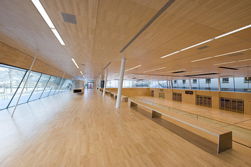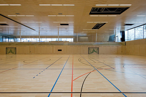 Schlichtheit als architektonischer Anspruch wurde bei dieser Halle bis zum gestalterischen Abmagern ernst genommen und durchgehalten. Schwere Kost für die Bevölkerung der Umgebung? Offenbar nicht. Ich musste mir sagen lassen, dass der Bau rundum angenommen ist. Nicht nur von den kleinen Kletterern, denen die Architekten mit der roten Linie einen Schuss Freiheit zum Ungehorsam zur Verfügung stellen. Die Turnhalle selbst hat die üblichen Ausmaße einer Dreifachturnhalle, erhält Licht von seitlich-oben und ist von den foyerseitigen Tribünen hervorragend zu überblicken. In Wirklichkeit braucht es für das Funktionieren einer solchen räumlichen Verschränkung ja nicht viel, da gibt es ausreichende Erfahrungswerte. Nur: Bequem sitzen möchte man schon. Hier sitzt man auf sehr schlichten Bänken (Esche), die versetzt angeordnet sind, so dass man wirklich gut sieht – und eben auch gut sitzt.