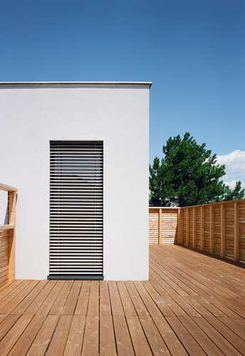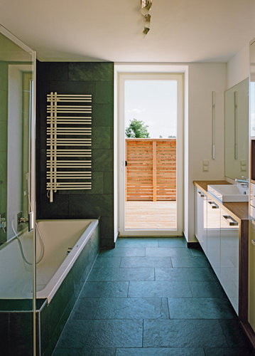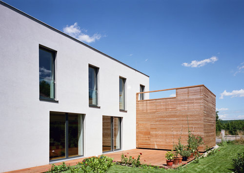 Die Fassade ist bis unter die Bodenplatte mit einem dicken Mantel aus Wärmedämmung überzogen, die thermische Hülle ist mit einem Blower Door Testergebnis von 0,3 [1/h] äußerst luftdicht. Den Wärmebrücken wurde mit thermischen Trennungen aus Purenit, Sylomer und Edelstahl entgegengewirkt. Die Lüftungsanlage wird mit vom Erdreich vorgewärmter Zuluft gespeist, die Spitzenlastabdeckung erledigt ein Alkoholofen.