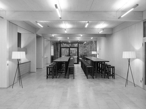 Unter der annähernd quadratischen und allseitig auskragenden Dachscheibe ist ein eingeschossiger H-förmiger Grundriss für 55 Arbeitsplätze organisiert. Zwei Höfe bilden den Außenraum: ein »Empfangshof« im Norden und ein privaterer Hof mit Blick zum tiefer gelegenen Werksgelände im Süden. Dazwischen liegt ein großzügiges Foyer, das Ankunfts- und Wartebereich, Cafeteria und zwei Besprechungsräume aufnimmt. Von hier aus werden drei Bürotrakte und ein Konferenzbereich erschlossen, im Untergeschoss befinden sich Haustechnikräume, Nebenräume und eine Garderobe für Veranstaltungen.