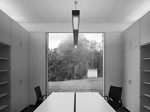 Die Büros sind als Zellenbüros mit je zwei Arbeitsplätzen in einem Achsraster von 5,0 Metern konzipiert. Eine Ausnahme bilden die Büros im Süden der Riegel, wo sich Räume mit drei Arbeitsplätzen und die Geschäftsleitung zum Werk hin orientieren. Der gleichmäßige Wechsel von offenen und geschlossenen Flächen erzeugt einen fließenden Raumübergang zwischen außen und innen.