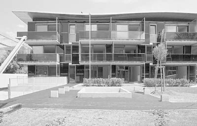 Dass die ziemlich edle und aufwendige, dafür aber auch sehr dauerhafte und pflegeleichte Glasfassade in diesem engen Rahmen finanzierbar war, hat wohl mit der Kompaktheit der Baukörper zu tun und mit der Ökonomie der Konstruktion. Außerdem hat Driendl auf alle technisch aufwendigen (und teuren) Installationen verzichtet: Es gibt keine Lifte, und es gibt zwar Sonnenkollektoren für die Warmwasserbereitung, aber keine kontrollierte Be- und Entlüftung. Sonnenenergie wird hier passiv genützt; das funktioniert immer, es bedarf keiner Wartung, und Niedrigenergiehäuser sind es - durch die intelligente Planung - trotzdem geworden.