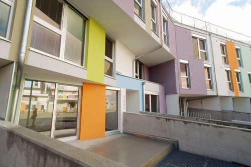 Seit ein paar Tagen ziehen die neuen Bewohner bereits mit Sack und Pack in die neue Wohnhausanlage am Orasteig, geplant vom Wiener Architekturbüro PPAG. Statt kleiner Einzelhäuschen vom Band gibt's eine heterogene vierstöckige Bebauung, die vor allem in chromatischer Sicht überaus auffällig ist. In insgesamt zwölf Farben pinselten die beiden Architekten Georg Poduschka und Anna Popelka bestimmte Farbfelder an der Fassade an und leisten damit auf ihre Weise einen Beitrag zur ganzjährigen Osterfeierei.