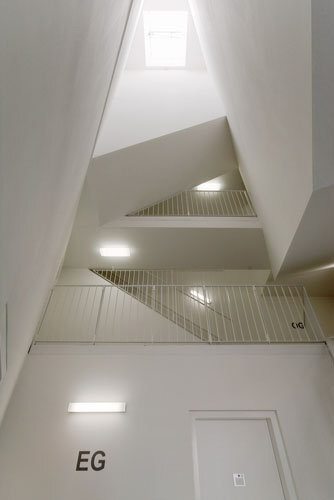 Warum diese komplizierte Verschachtelung der einzelnen Wohnungen? Schließlich fallen die Eingangstüren spätestens bei Schlüsselübergabe ins Schloss und bleiben für den Großteil der Bewohner uneinsichtig. „Ich bin davon überzeugt, dass man die Individualität dem Gebäude auch dann ansieht, wenn man nicht mehr ungehindert in jede Wohnung gelangen kann“, erklärt Georg Poduschka, „es ist ein Unterschied, zu wissen, ob über und unter mir an exakt der gleichen Stelle die Ehebetten deckungsgleich übereinanderliegen oder nicht.“