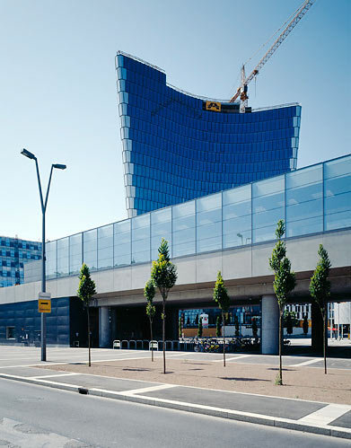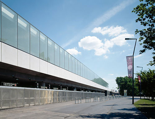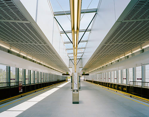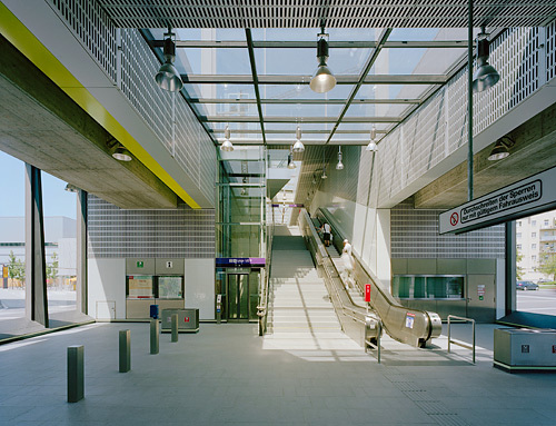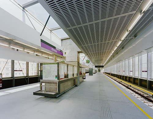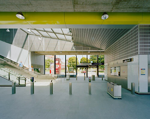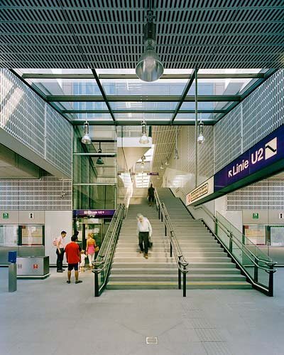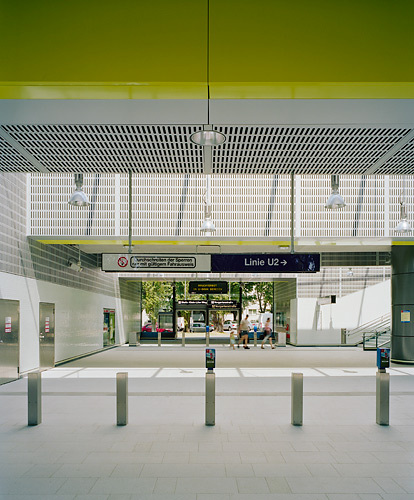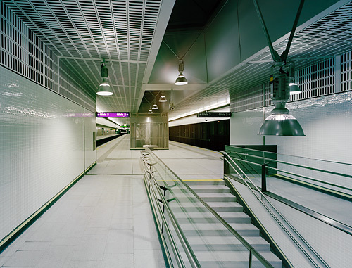 Ziel der Gestaltung ist es, eine dem Zweck entsprechende, dem städtischen Umraum und der Funktion adäquate Gebäudekonzeption zu finden. Insbesondere wird versucht, dass durch Material und die gewählten Proportionen ein selbstverständliches Ganzes entsteht, dessen Präsenz nicht penetrant aber dennoch einprägsam ist. Die Objekte sind in ihren Elementen wie auch in ihrem Ganzen als kleine Serie mit hoher Selbstähnlichkeit entwickelt und ergeben daher eine linienspezifische Gesamtwirkung. Grundsatz ist, möglichst helle, übersichtliche und gut zu erhaltende Gebäude zu errichten. Dominierend sind die Betonteile des Streckenbauwerkes, welches im Bereich der Stationen unter- bzw. überbaut wird. Diese Bauwerke sind im oberen Bereich großflächig verglast. Die unterbauten Teile gliedern sich in Metallwandver-kleidungen mit integrierten Lüftungsjalousien und Toren bzw. in Verglasungen. Die Metallteile sind aus anthrazit-färbigem Emailblech, das einen weichen, die Glas- und Betonflächen kontrastierenden Baukörpereindruck ergibt, ausgeführt. Wo die Möglichkeit besteht, wird durch die Einplanung urbanen Grüns eine zeitgemäße und ortspezifische Gesamtwirkung erzielt. Im Inneren wird mit stärkeren Kontrasten zur Leitfarbe weiß und farbigen Akzenten ein heller und leichter Raumeindruck erreicht. Sitzgelegenheiten und andere die Stationen funktionell ergänzenden Einrichtungsgegenstände sind aus strapazfähigen Metallkonstruktionen hergestellt. Das Beleuchtungskonzept schafft auch für die Nachtstunden eine angenehme, sichere Lichtstimmung.