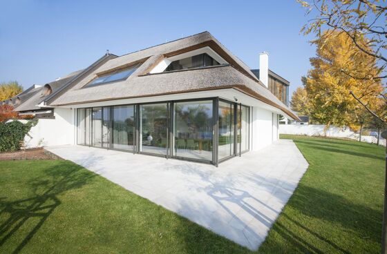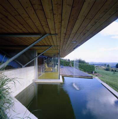 Draußen in der Wiese, unmittelbar vor dem Home-Office des Bauherrn, befindet sich ein Teich, der mit offener Dachentwässerung und Wasserfall für Ablenkung sorgt. „Wir bemühen uns, zu Hause zu arbeiten, aber manchmal ist das hier überaus schwierig“, gestehen die Bewohner. Der Blick der Baufrau schweift über Liegestühle in den Garten, wo sich ein Kraftplatz mit beachtlichen Energiewerten befindet. Und ja, still ist es hier. Das begehrte Hi-Fi-Sound-System hat bis zum heutigen Tag Funkstille.