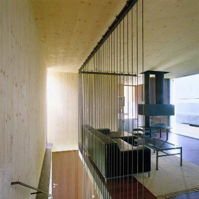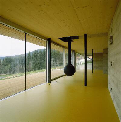 Über die mit Holzstrukturschalung gefertigte Betonwand, die das Rückgrat des Hauses bildet, ist das Gebäude mit dem Hang verankert. Ansonsten ist von der Statik im Innenraum nicht viel zu sehen. Dafür gibt es zwei Feuerstellen, die durch eine zweigeschoßige Sonderkonstruktion des Architekten ermöglicht wurden. Oben funktioniert der Ofen wie ein Tablett, unten wärmt eine drehbare Kugel den Rücken. Gerne experimentieren die Bauherren mit den feinen Gerüchen unterschiedlicher Brennhölzer.