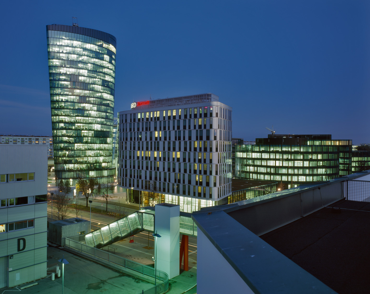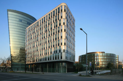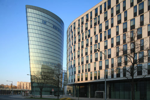 Eines vorweg: Es ist keine schlanke, hohe Nadel, die Henke und Schreieck geplant haben. Das Haus steht fest auf der Erde und ist mit seinen 80 Metern Höhe möglicherweise sogar zu niedrig. Aber die diversen Kubaturen der Gebäude wurden natürlich im Vorfeld des komplexen Wettbewerbsverfahrens festgelegt, daran war nicht zu rütteln. Andererseits sagen die Architekten, dass ihr Haus nicht Raum besetzt, sondern Raum bildet. Das ist zumindest teilweise richtig. Denn es besteht aus einem konkav/konvex gebogenen Baukörper, der einen großzügigen Vorplatz definiert (übrigens möbliert mit einer wunderbaren, amorphen, grünen Plastik von Lois und Franziska Weinberger). Es nimmt viel Grundfläche ein, wenn man es mit herkömmlichen Hochhäusern vergleicht. Dafür kann es umso mehr.