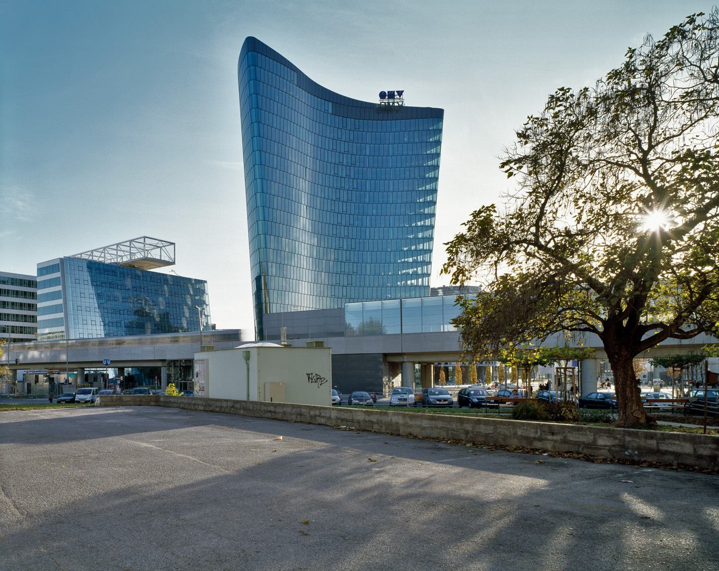 Die Form des Hauses hat eine Vorgeschichte. Es gab einen städtebaulichen Wettbewerb, den Henke und Schreieck mit einem Konzept gewonnen haben, das eine durchgängige Bebauung mit konvex/konkav geformten Baukörpern vorgesehen hätte. Lauter Bumerange – oder wie es Margherita Spillutini formuliert: „Kipferl“. Solche Baukörper ermöglichen trotz hoher Dichte Durchlässigkeit – auch in Bezug auf den Ausblick – und die Formulierung spannender Außenräume. Die sind wichtig, und sie kommen bei uns regelmäßig zu kurz. Trotzdem wurde das Konzept zugunsten einer anderen, nicht zuletzt durch die Landschaftsplaner mitbestimmten Lösung aufgegeben. Der OMV-Bumerang ist daher durch eine Brücke mit dem durchaus rechtwinkligen Nachbarn von Martin Kohlbauer verbunden, nur vier verhältnismäßig niedrige – bumerangförmige – Baukörper von Henke und Schreieck schräg gegenüber gehen noch auf das ursprüngliche Städtebau-Projekt zurück.