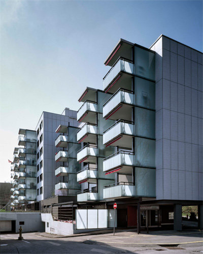 Bezüglich der Lagequalität muss die starke Lärmbelastung an der verkehrsreichen Hauptstrasse vom ruhigen begrünten Innenhof unterschieden werden. Dessenungeachtet basieren alle Grundrisse auf einer rigiden Schottenbauweise (mit Abständen von 2,96 und 3,66 Metern). Von Fassade zu Fassade verlaufen tragende Wände, die eine nicht tragende Gebäudehülle in Holzbauweise ermöglichten. Zur Anwendung kamen seinerzeit gerade einmal 50 mm starke, hölzerne Fassadenelemente, die an den Längsseiten zwischen den Geschossdecken eingespannt waren. Als Wetterschutz dienten farbig beschichtete, grossformatige Faserzementplatten. Betonelemente schützten die Stirnseiten der Geschossdecken.