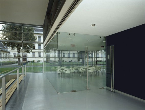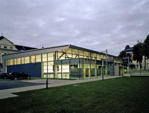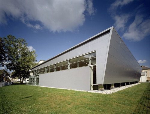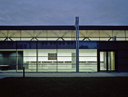 Gegen die Südsonne, zur Sterneckstraße, ist die Halle mit Absicht geschlossen. Nur an der horizontalen Schnittkante mit dem Gelände zieht ein verglaster Sichtschlitz durch.