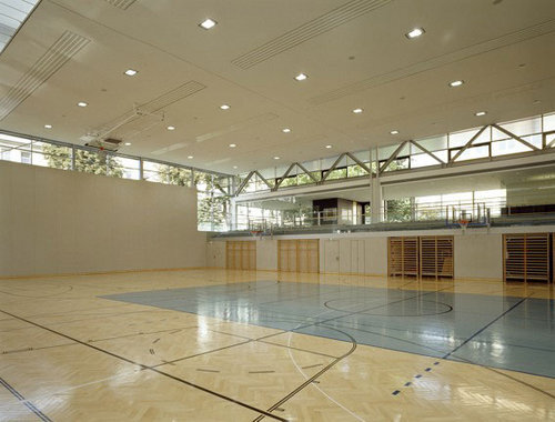 Blick von der Empore in den Innenhof: zur Linken die Tribünen – zur Rechten die Cafeteria