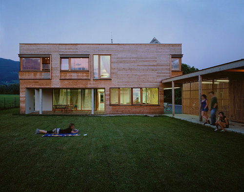 Großzügiger Freiraum für die Bewohner im Westen. Das Nebengebäude entlang der Südgrenze schließt diese Freifläche Richtung öffentliche Strasse ab. Dadurch entsteht ein privater und von der Öffentlichkeit uneinsehbarer Garten.