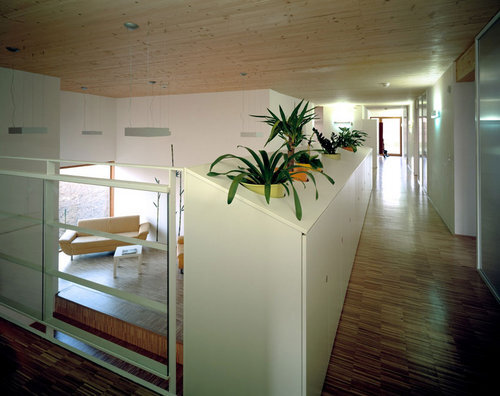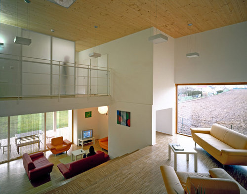 Sitzstufen verbinden den Kreativbereich mit dem Wohnbereich. Der Wohnbereich öffnet sich großzügig Richtung Garten, die Sitzstufen werden so zur Tribüne mit Blickrichtung Garten.