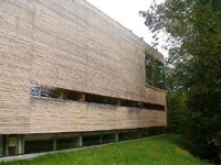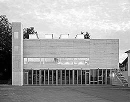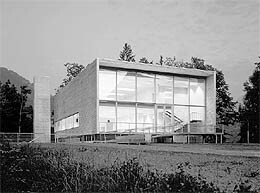 Das eingangs geschilderte und die genannten Bestrebungen exemplarisch ausführende Objekt ist das Feuerwehr- und Kulturhaus im Bregenzerwald. Nach dem hier schon rezensierten Veranstaltungszentrum Cubus in Wolfurt, dem Einfamilienhaus Hein in Fraxern und dem Wohnhaus der Lebenshilfe in Feldkirch ist das der vierte und reifste Bau von C/NS. Ihre schlüssige Schichtung von eigentlich schwer mit dem Stützpunkt der Freiwilligen Ortsfeuerwehr zu vereinbarendem Stadt- saal samt Probelokal der Bürgermusik und Ausstellungszentrum überzeugte 1998 die Wettbewerbsjury. Bestechend die Situierung am Rand eines steil abfallenden Tobels und die differenzierende Materialwahl: Die Feuerwehr fährt von der Hauptstraße in ihren aus Beton, verzinktem Stahl und Glas gefertigten Gebäudesockel; ein Geschoß höher und um neunzig Grad gedreht, öffnet sich der in unbehandelter, heimischer Weißtanne ausgeführte Kulturbereich zum Dorfzentrum.
