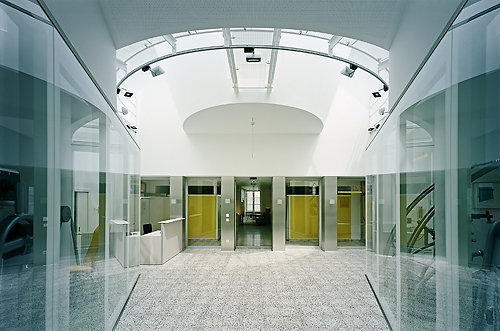 Damals, im Jahr 2001, fand ein geladener Wettbewerb mit drei Teilnehmern statt, den das Büro gewonnen hat. Mit gutem Grund, muss man nachträglich sagen, denn die ursprüngliche Substanz des Engelsbades umschloss einen großen Innenhof; und genau in den haben die beiden anderen Projektanten den geforderten neuen Bettentrakt hineingestellt. Veselinovic-Resetarits schlugen hingegen vor, diesen Bettentrakt als Brückenbauwerk über dem niedrigen Bestand – er enthält ein Therapiebad und ein großes Schwimmbad – zu errichten. So blieb der wunderbare Innenhof frei und erhalten, jetzt ist er von den Landschaftsplanern Cordula Loidl-Reisch und Anna Detzlhofer sogar besonders reizvoll bepflanzt.