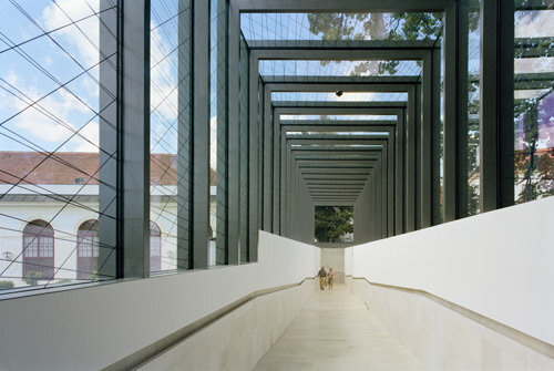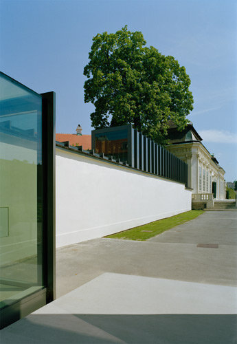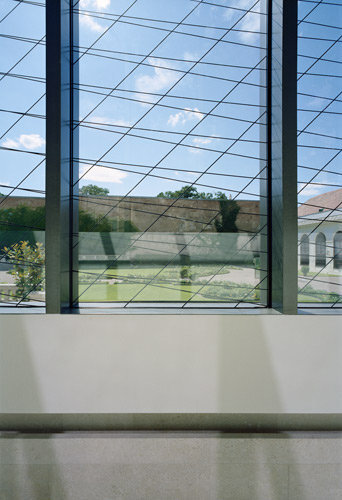 Verglasung mit einer grafischen Arbeit von Heimo Zobernig überzogen, dient zugleich dem Schutz der Vögel vor Aufprall