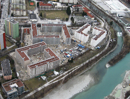 Für die Bebauung des am nördlichen Rand der Innsbrucker Reichenau liegenden Areals der ehemaligen Tiroler Lodenfabrik wurde 2005 ein Wettbewerb ausgeschrieben, den die Architekturwerkstatt din a4 für sich entscheiden konnte. Ihr städtebauliches Grundkonzept besteht aus drei Gebäudekomplexen, die jeweils wieder aus zwei gegeneinander gestellten L-förmigen Baukörpern zusammengesetzt sind, die durch ihre Verschränkung große Innenhöfe bilden. Diesem klar strukturierte Konzept einer offenen Blockrandbebauung folgend wurden die drei Bauteile zwei mit insgesamt 354 Mietwohnungen für die Neue Heimat Tirol und einer mit 128 Eigentumswohnungen für die Zima von der Architekturwerkstatt din a4, team k2 sowie der Architekturhalle Wulz-König realisiert.