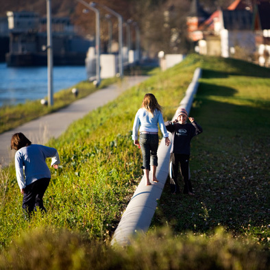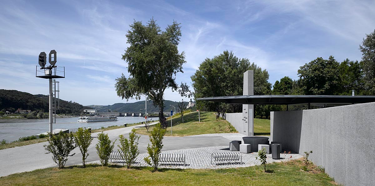 Es ist in Österreich nicht üblich, besondere Überlegungen auf die Gestaltung technischer Infrastrukturbauten zu verwenden. Kein Wunder, dass vorerst die Planung des Hochwasserschutzes an der Donau ohne architektonische und landschaftsplanerische Kompetenzen in Gang kam. Wasserbauingenieure sind darin geschult, die Kraft des Wassers mit allen technischen Finessen in die richtigen Bahnen zu lenken. Der Großteil davon – Pumpwerke, Fundierungen und Drainagen – tritt ohnedies nicht zutage. Den sichtbaren Dämmen, Schutzmauern und Wänden, in die bei Hochwassergefahr mobile Schutzelemente eingehängt werden, gesteht man zu, zwar nützlich, aber nicht schön sein zu müssen. Gerade in den reizvollen Landschaften des Nibelungengaus und der Wachau gänzlich ohne Gestaltungskompetenz zu agieren erschien wohl auch den zuständigen Landesbehörden fahrlässig, und so schlug man den Gemeinden Architekten und Landschaftsplaner vor, die für die Gestaltung der sichtbaren Elemente Sorge tragen sollten. Bürgermeister Manfred Mitmasser erinnert sich daran, dass er anfangs wenig darüber erbaut war, sich neben den Ingenieuren auch noch mit Architekten befassen zu müssen. War die Bauaufgabe doch beieiner pragmatisch ingenieurbaumäßigen Herangehensweise schon aufwendig und teuer genug. Immerhin hatte die Gemeinde 20 Prozent der Kosten zu tragen. Heute ist er froh darüber, einen hartnäckigen Architekten an seiner Seite gehabt zu haben.