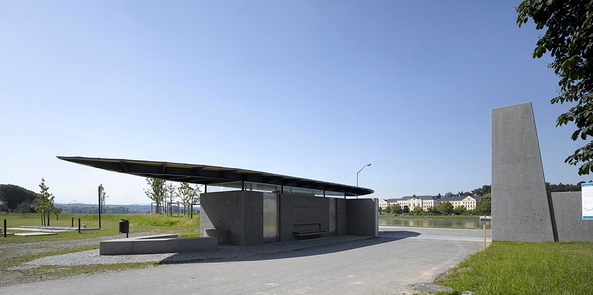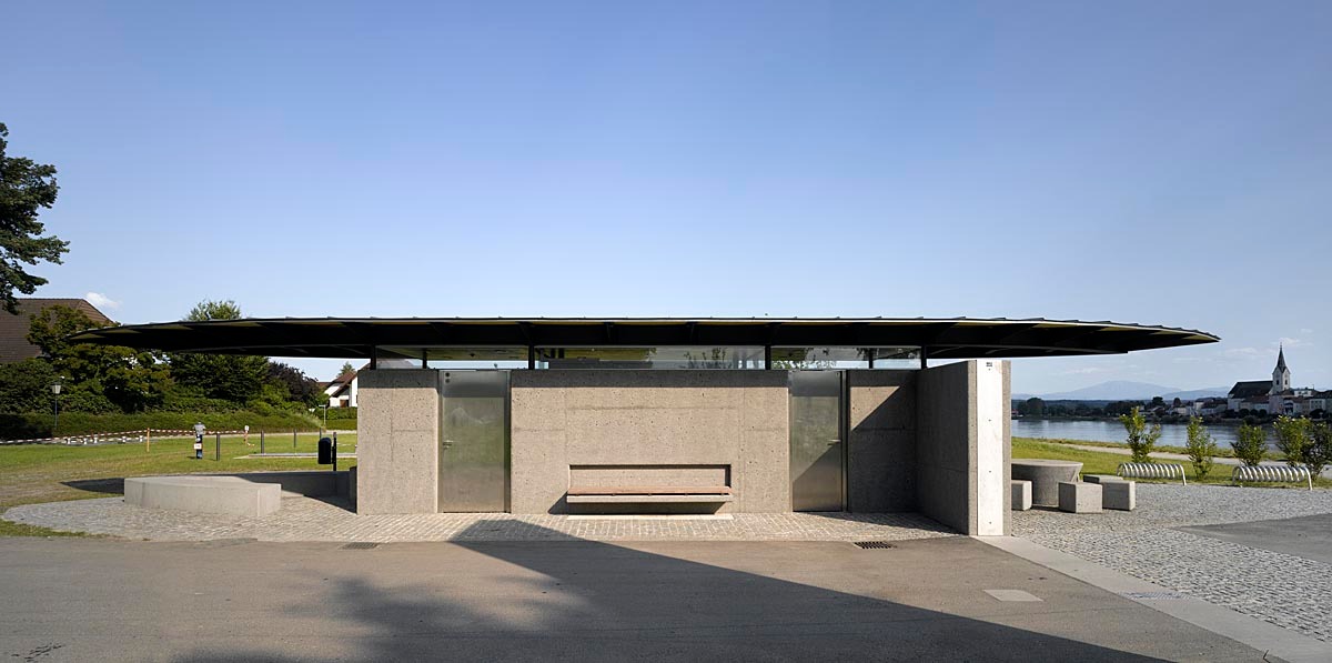 Von einer außerordentlichen Anmut ist die Ausführung des Betons: Dunkles Hartgestein aus dem nahen Steinbruch Loja und Eisenoxid verleihen ihm eine Färbung, die jener des Felsens von Schloss Persenbeug nahekommt. Ecken wurden sandgestrahlt, Flächen gestockt. Das wirkt edel und altert schöner als schalreine Oberflächen. Was passiert wäre, wenn Gemeinde und Ingenieure die Kooperation mit den Architekten verweigert hätten, mag man sich gar nicht ausmalen. Der Wachau weiter flussabwärts wäre eine ähnlich sorgfältige Behandlung der Schutzbauten ebenfalls gut zu Gesicht gestanden.