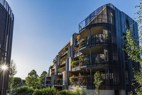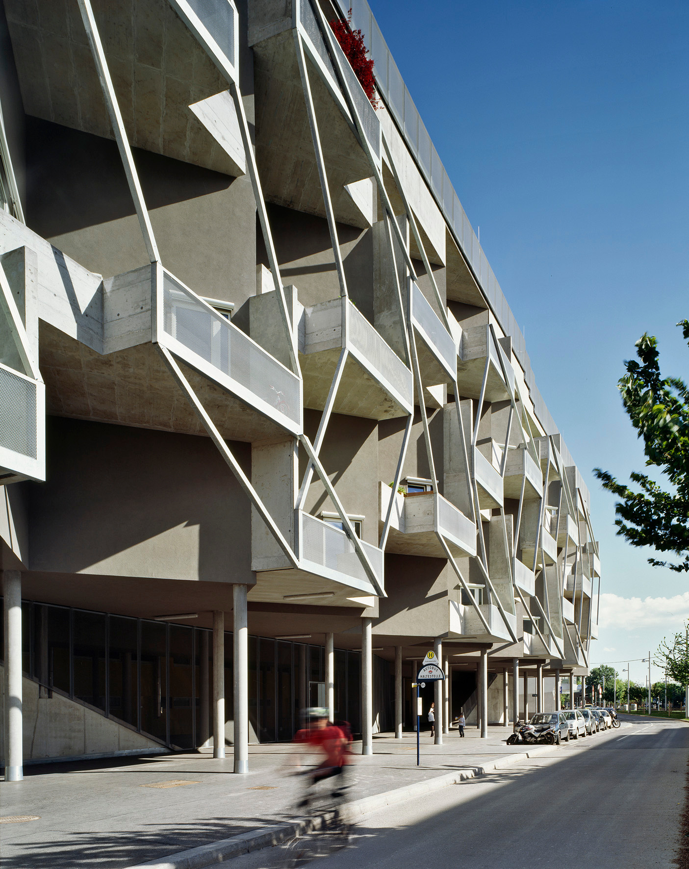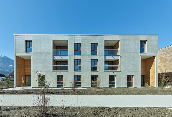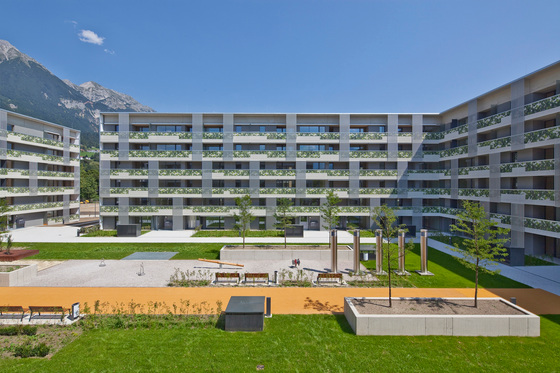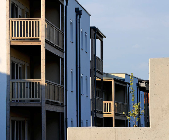 Artec verstärkt die eigenwillige, vom geschoßweisen diagonalen Versatz bestimmte Geometrie dieser Straßenfront durch ein zusätzliches skulpturales Element: Kantrohre aus verzinktem Stahl, die – schräg über die Fassade geführt – ein einprägsames Bild ergeben und zum Markenzeichen des Projekts werden dürften. Metallgitter als Balkongeländer bilden eine weitere Schicht, zu der im Lauf der Zeit die Begrünung kommen wird. Die zurückhaltende Farbgestaltung nach außen – warmgraue Putzfassaden und Sichtbeton – muss überhaupt in Erwartung üppigen Grüns beurteilt werden: Vorbild in dieser Hinsicht ist für Artec die Terrassenhaussiedlung der „Werkgruppe Graz“ aus dem Jahr 1978, die wildere und lebendigere steirische Antwort auf den Wohnpark Alt-Erlaa.