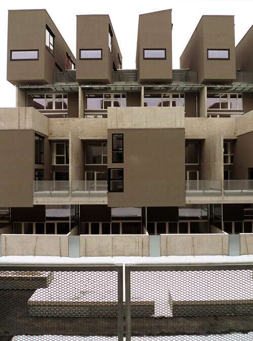 Auch Artec erzielt bei seinem Wohnbau in der Tokiostraße eine bemerkenswert hohe Dichte, die allerdings durch eine besondere „Lufthaltigkeit“ kompensiert wird. Zwei großzügige, von oben belichtete Hallen dienen, gewissermaßen als überdachte Straßen, der Erschließung der Wohnungen. Dieser Typus ist zwar nicht neu, wie Artec diese Räume konzipiert, ist allerdings eine Sensation im eigentlichen Wortsinn, die auf Fotos kaum wiederzugeben ist. Diese Hallen sind tatsächlich nutzbar, mit breiten Wegen und Abstellflächen vor den Wohnungen. Das Farbkonzept setzt „leise“ Farben in der Halle in Kontrast zu einem kräftigen Signalrot in den Treppenhäusern, die als halböffentliche Bewegungsräume nicht zur Halle, sondern zum Straßenraum orientiert sind.