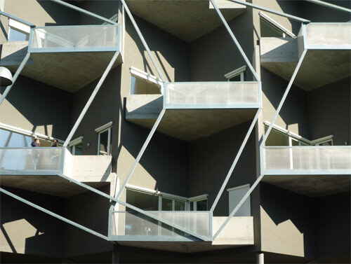 Artec verstärkt die eigenwillige, vom geschoßweisen diagonalen Versatz bestimmte Geometrie dieser Straßenfront durch ein zusätzliches skulpturales Element: Kantrohre aus verzinktem Stahl, die – schräg über die Fassade geführt – ein einprägsames Bild ergeben und zum Markenzeichen des Projekts werden dürften. Metallgitter als Balkongeländer bilden eine weitere Schicht, zu der im Lauf der Zeit die Begrünung kommen wird. Die zurückhaltende Farbgestaltung nach außen – warmgraue Putzfassaden und Sichtbeton – muss überhaupt in Erwartung üppigen Grüns beurteilt werden: Vorbild in dieser Hinsicht ist für Artec die Terrassenhaussiedlung der „Werkgruppe Graz“ aus dem Jahr 1978, die wildere und lebendigere steirische Antwort auf den Wohnpark Alt-Erlaa.