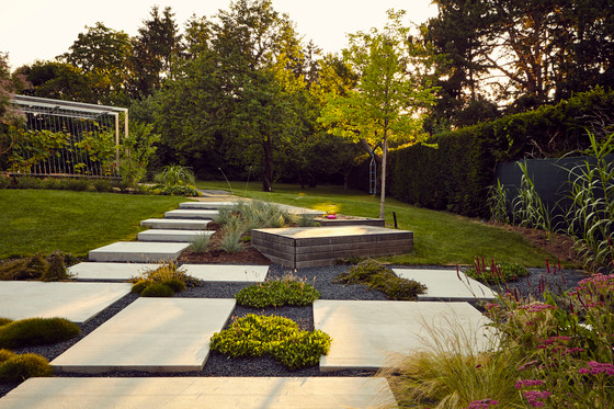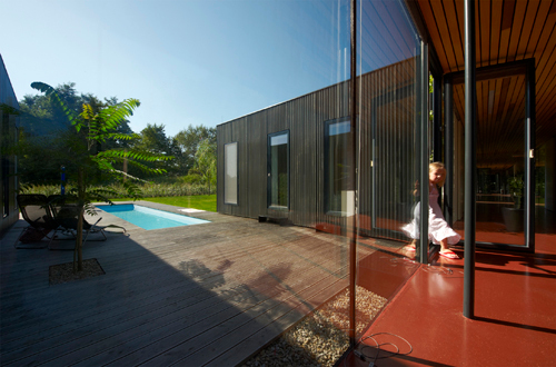 Jedes Atrium hat seinen ganz eigenen Charakter. Zwischen Wohn- und Schlaftrakt befindet sich ein zehn Meter langer Pool, zwischen Küche und Garagentrakt hingegen liegt für den begeisterten Hobbykoch ein kleiner Gemüsegarten bereit. Daneben wachsen Weinreben in die Höhe. Sie dienen dazu, eines Tages die vollkommen verglasten Verbindungsgänge zwischen den einzelnen Hausteilen zu überwachsen und in einen schattigen Schleier zu hüllen. „Nächstes Jahr zu dieser Zeit“, sagt der Bauherr, „wird alles zugewachsen sein.“