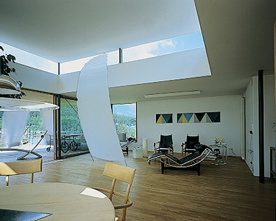 Der eigentliche Reiz des Hauses ist jedoch seine Dreiteilung. „Die meisten Häuser in dieser Gegend bestehen aus Keller, Wohngeschoß und ausgebautem Dachgeschoß“, erklärt Architekt Robert Diem. „Wir haben die Funktionstrennung von Lager und Garage, von Kochen und Wohnen sowie von Baden und Schlafen zwar beibehalten, aber nicht übereinander, sondern hintereinander angeordnet.“