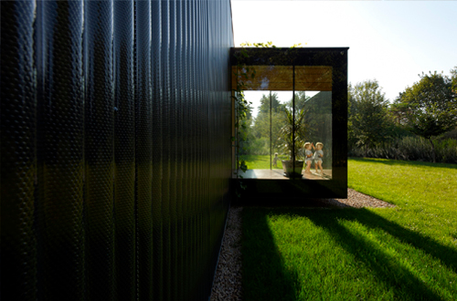 „Da stehen zwei Kunstwerke auf einem Fleck“, schwärmt Bauherr Martin, „da der Turm vom Hutzinger und hier mein Haus.“ Besonders kunstvoll erscheint die Fassade, die je nach Lichteinfall mal schwarz, mal leuchtend hell erstrahlt. Durch das transparente Polycarbonat und die Abdichtungsfolie dahinter entsteht der Eindruck teuren Carbons. Martin Diem: „Die Fassade ist billig und simpel aufgebaut und sieht trotzdem edel aus. Was will man mehr?“