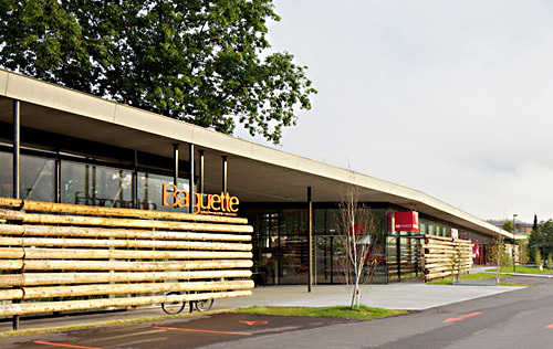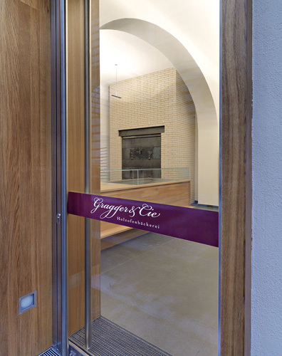 Der Verkauf der Backwaren sozusagen direkt am Ofen entspricht der französischen Tradition, die die Inspiration des Boulangerie-Projektes bildete. Den vom Bäckermeister gemeinsam mit einem oberösterreichischen Hafner entwickelten, 10 Tonnen schweren doppelstöckigen Holzofen, der erst nach langwierigen Verhandlungen mit dem Gewerbeamt realisiert werden konnte, verkleidete Radatz mit cremefarbenen Klinkern. Nächtens wird der Ofen mittels in den Boden eingelassener Spots effektvoll als das schon von Weitem sichtbare Herz des Betriebs inszeniert.