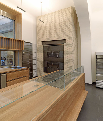 Platzmangel führte auch im Inneren zu durchdachten Lösungen mit schlichter, formal sehr zurückgenommener Umsetzung. Vorne werden die Brote verkauft, die zwei Bäcker in der hinten im ehemaligen Pferdestall untergebrachten Backstube mit Hilfe eindrucksvoller Knet- und Teigteilmaschinen aus den Fünfzigerjahren fertigen. Als Verbindung zum rückseitig befüllten und vorne ausgeräumten Holzofen, der das funktionale und architektonische Zentrum des Geschäfts bildet, wurde ein enger Lichthof überdacht und so zum Verbindungsgang gemacht.